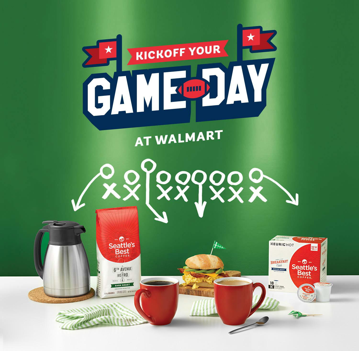 At Mosaic North America, I developed concept sketches, art directed photo shoots, and finalized creative for a seasonal campaign collaboration, “Game Day,” featuring Seattle’s Best Coffee and Walmart during football season. This in-store campaign encouraged shoppers to kick off their morning with the smooth, bold flavor of Seattle’s Best Coffee—perfectly paired with fresh cold cut sandwiches from Walmart’s Marketplace. Whether prepping for tailgating or a game day watch party at home, this convenient combo sets the tone for a fun, flavorful, and eventful football evening. The pairing delivers both energy and satisfaction, giving shoppers everything they need to power through the day and cheer on their team in style.
